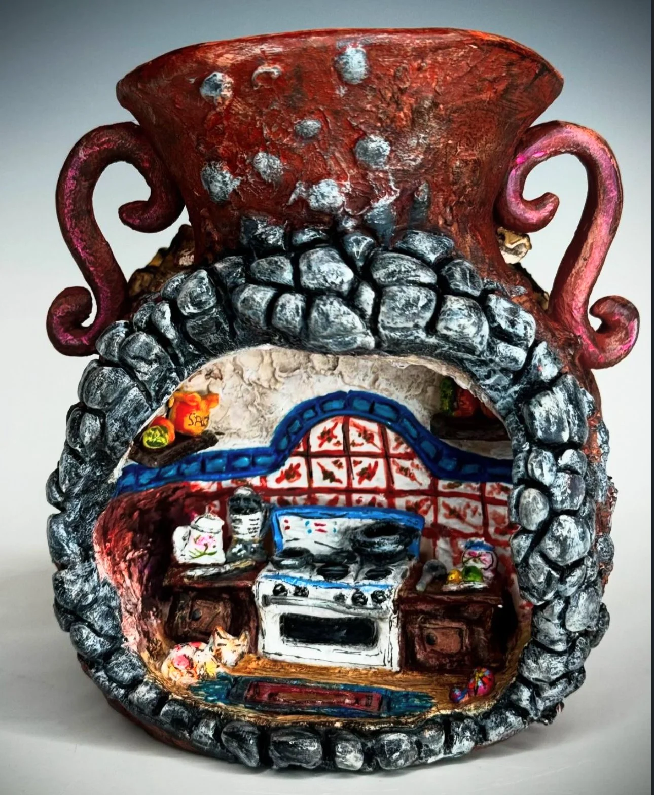 Side View of "Our home" Sculpture by Carmen Casillas- Clay and acrylic paint- 4x4x5 in.